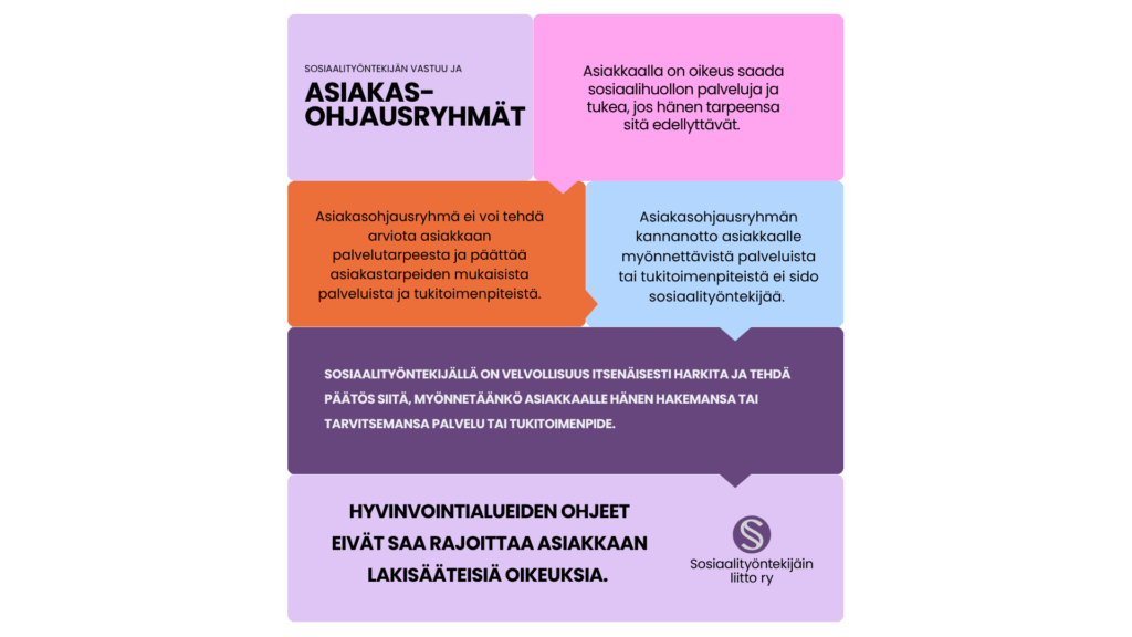 Kuten olemme viime aikoina mediastakin lukeneet, sosiaalityössä syntyy yhä useammin tilanteita, joissa päätöksiä tai linjauksia tehdään moniammatillisissa asiakasohjausryhmissä. Vaikka yhteistyö eri toimijoiden välillä on tärkeää, asiakkaan oikeuksia ei voida siirtää ohjeiden tai ryhmien sisäisten käytäntöjen varaan.